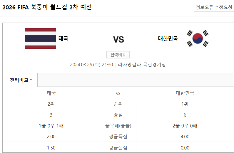 이번 3월 26일 오후 9시30분(한국시간) 태국 방콕 라자망갈라 스타디움에서 열리는 대한민국, 태국과의 원정 경기는 한국 축구에게 여러 면에서 중요한 시험대가 될 것으로 보인다. 태국 원정 경기에 이기더라도 한국은 5.26점 밖에 얻지 못한다. 무승부시에는 7.24점, 패배할 경우에는 19.74점을 더 잃기 때문에 26일 벌어질 태국과 아시아지역 2차 예선 C조 4차전에서는 실점을 하지 않는 것이 무엇보다 중요하다.