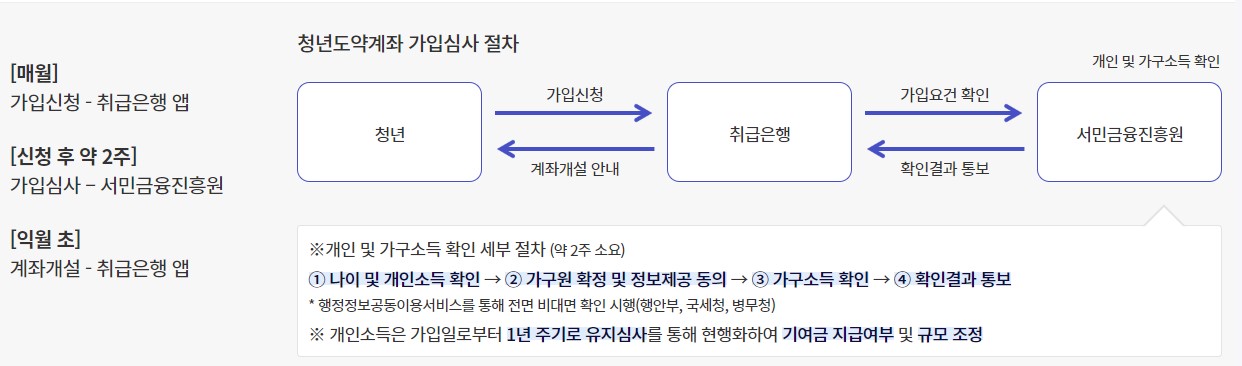 청년도약계좌 신청은 매월 진행됩니다. 자격 조건 여부 확인, 접수, 개좌 최종 개설까지는 약 1달이 걸립니다.