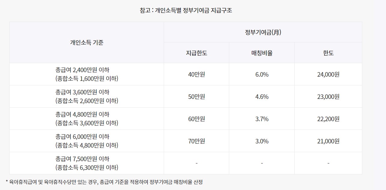 - 정부 지원: 정부는 최대 월 40만 원까지 매칭 지원금을 제공합니다.
