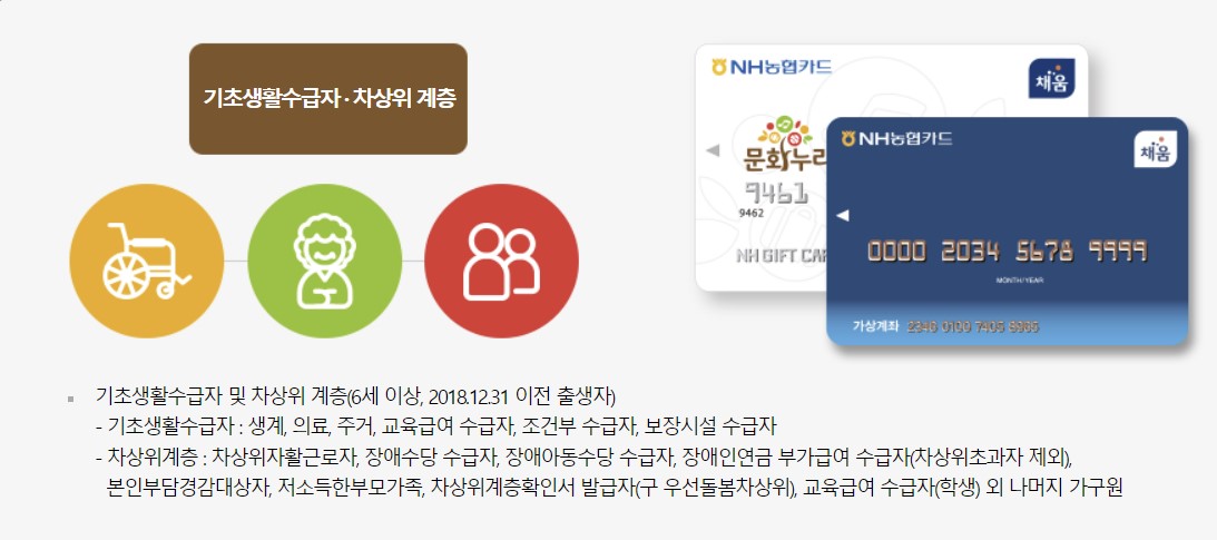 2024년에는 문화누리카드가 기초생활수급자와 차상위계층을 대상으로 하여, 문화를 통하여 삶의 질을 향상하고 문화적 격차를 줄이기 위해 문화예술, 국내여행, 그리고 체육활동을 지원하는 카드입니다. 각 인원당 연간 13만 원이 지원됩니다.