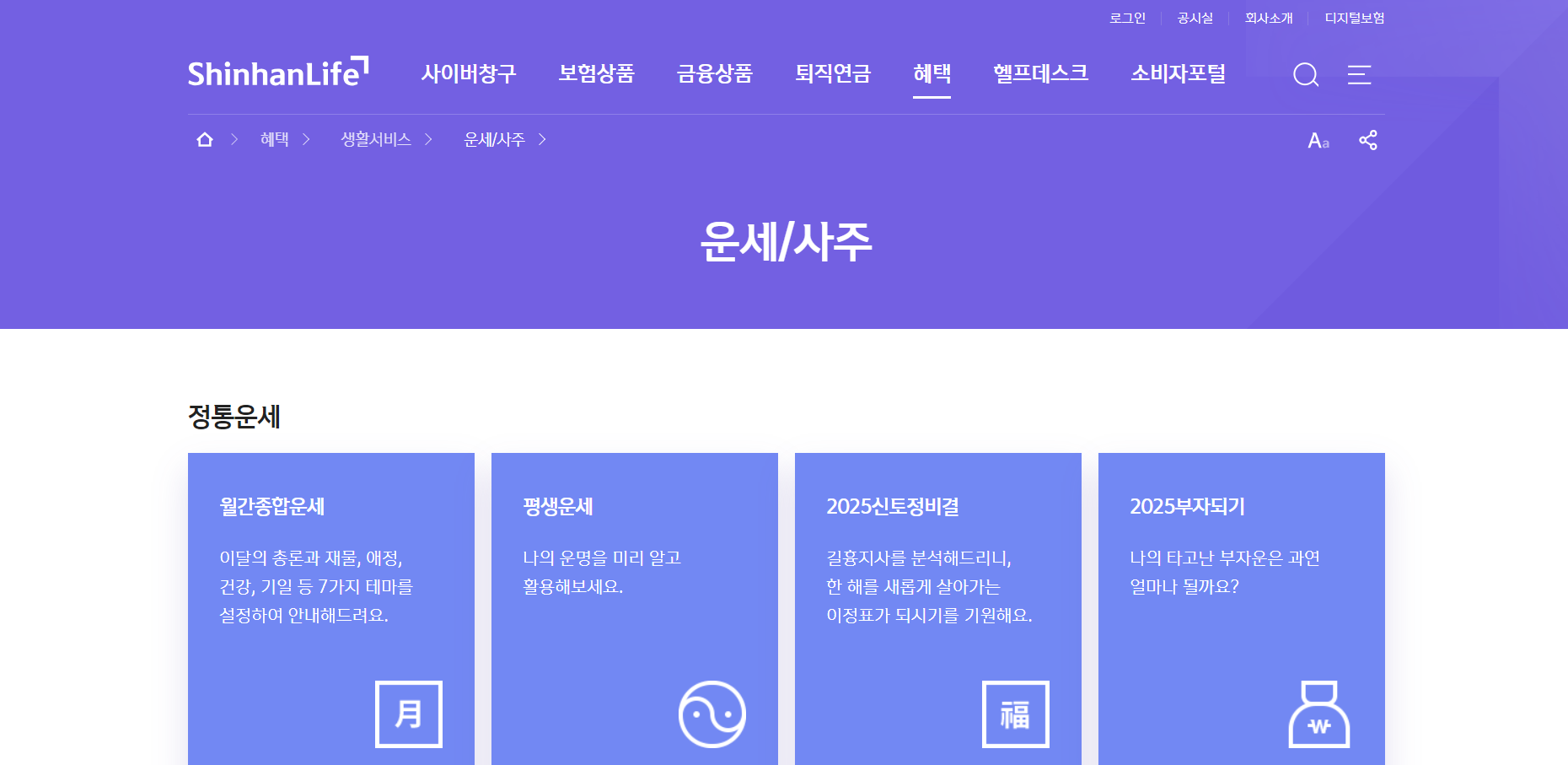 신한라이프에서는 고객들을 위해 신년운세와 토정비결을 무료로 제공하고 있는 대표적인 무료 운세 사이트입니다. 생년 월일을 입력하면 전반적인 운세뿐만 아니라 직장운, 재물운, 애정운 등 상세한 정보를 확인할 수 있습니다.